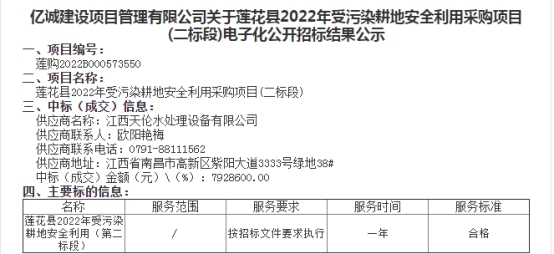 熱烈祝賀我公司2022年5月17日喜中《江西省蓮花縣2022年受污染耕地安全利用采購(二標段)項目》。